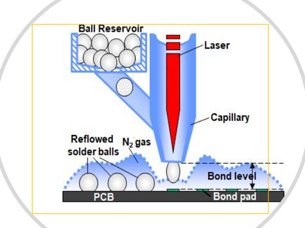 采用激光加熱錫球,并通過一定的壓力噴射到需要植球鍵合位置,是一種 新型植球技術(shù)。具有非接觸、無釬劑、熱量小、釬料精確可控等優(yōu)點。